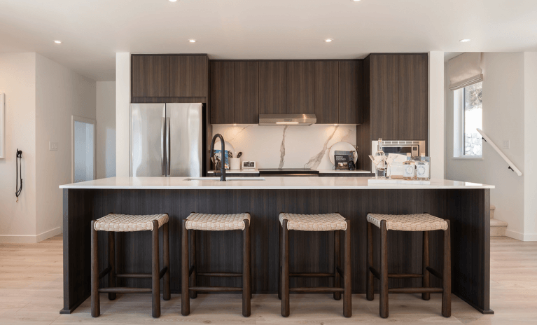 Terrain takes inspiration from Mountain Modern architecture, featuring sharply pitched rooflines, black-framed windows, and vertical siding. The homes have been designed to act as a respite from the elements. Step inside and find thoughtfully designed open concept floorplans featuring beautiful kitchens with spacious islands. Stay comfortable all year with an efficient heat pump heating and air conditioning system. And, enjoy the convenience of overheight garages with side-by-side parking for two cars, a Level 2 EV rough-in, and space to store your outdoor gear.